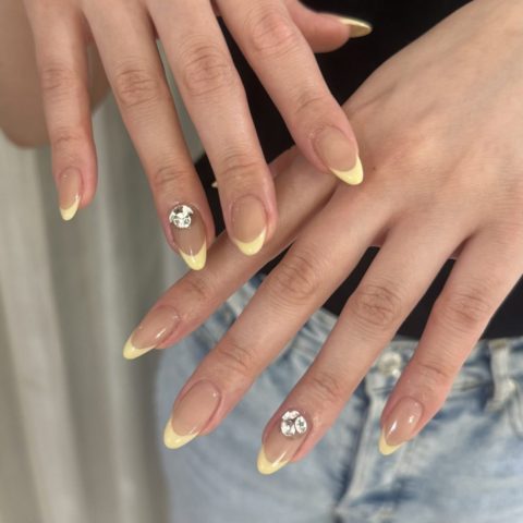 #フレンチネイル#イエローネイル#夏ネイル#Vカットストーン